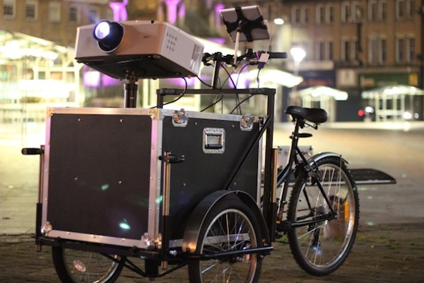 The equipment used: The light cycle is a fully mobile street art device, housing a high power digital projector, ipad, macbook pro, sound system and battery pack. It is used as an innovative method of taking digital art into public spaces, and as a means of transforming disused area's.